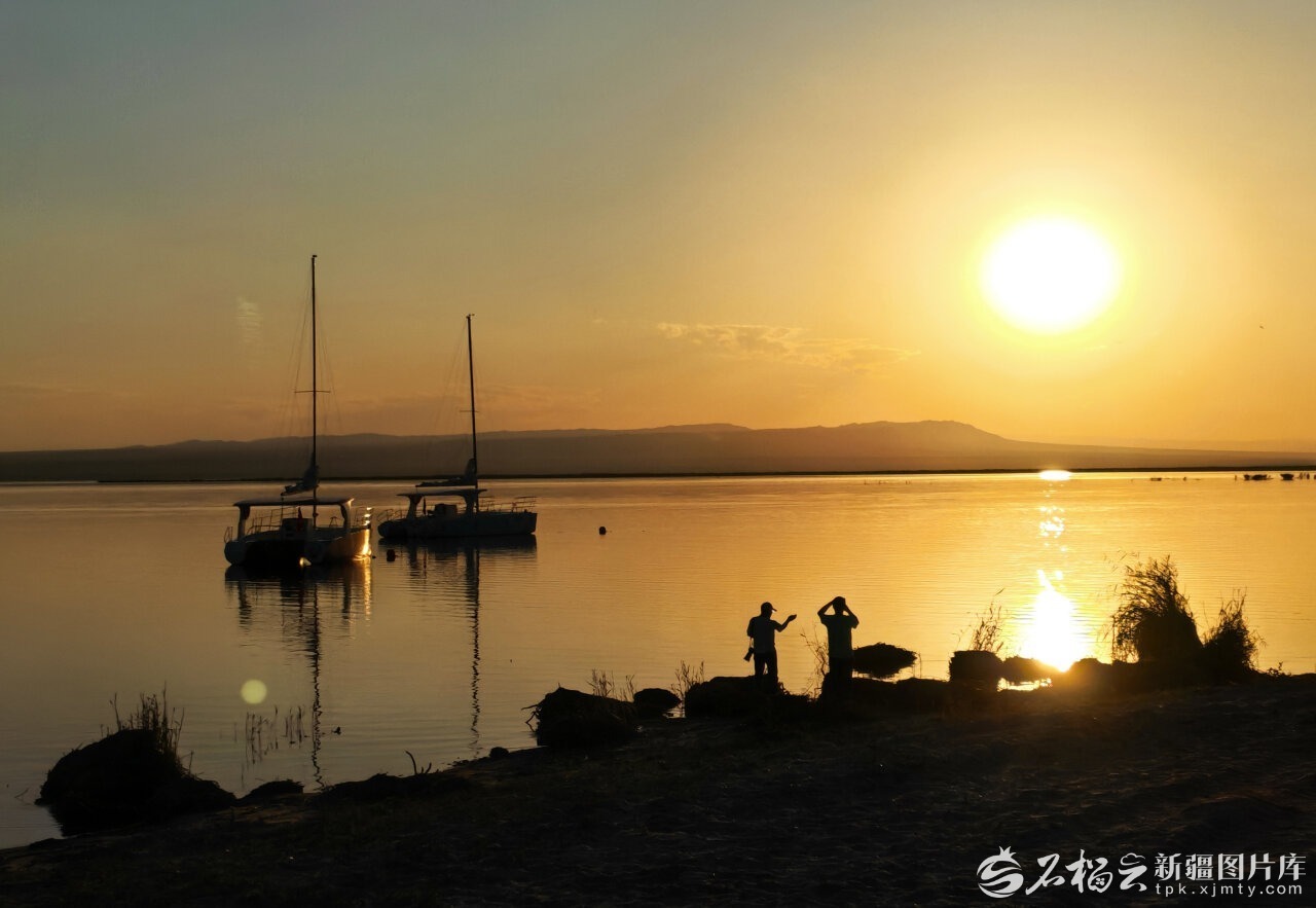 9月8日,夕阳西下,乌伦古湖海上魔鬼城景区呈现出一幅渔舟唱晚的画面。