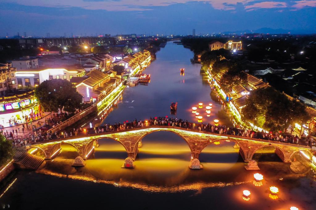 10月2日,游客在塘栖古镇的广济桥观赏运河夜景(无人机照片)。新华社记者 徐昱 摄