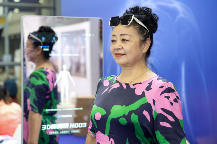 9月12日,观众在2025深圳国际智慧养老产业博览会现场体验3D体测镜。新华社记者梁旭 摄