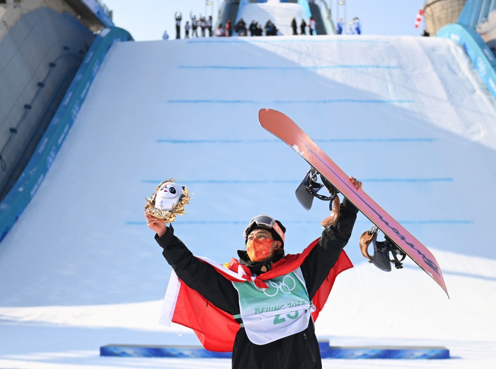 2022年2月15日,中国选手苏翊鸣在夺得北京冬奥会单板滑雪男子大跳台冠军后庆祝。新华社记者 黄宗治 摄