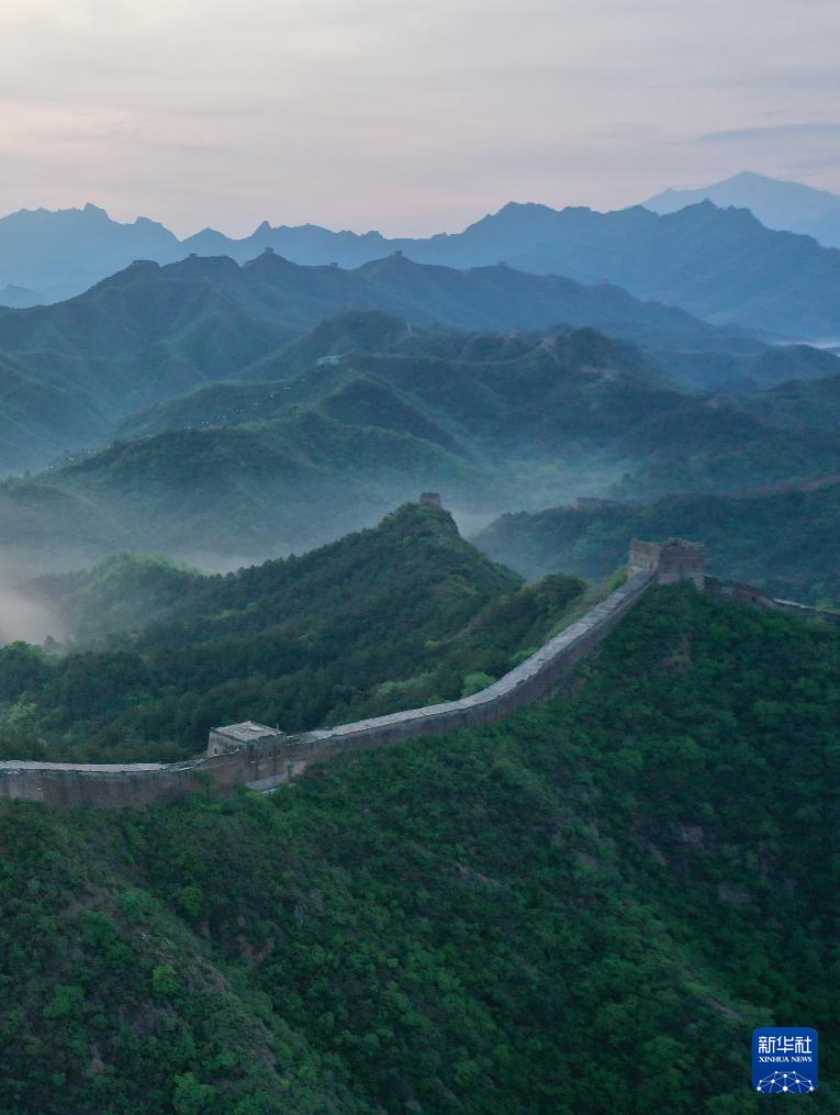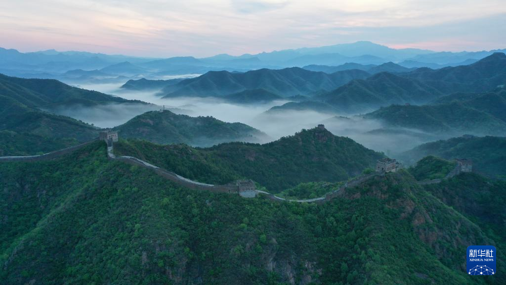 这是5月10日清晨在河北省承德市滦平县拍摄的金山岭长城云雾景象(无人机照片)。新华社发(周万平 摄)