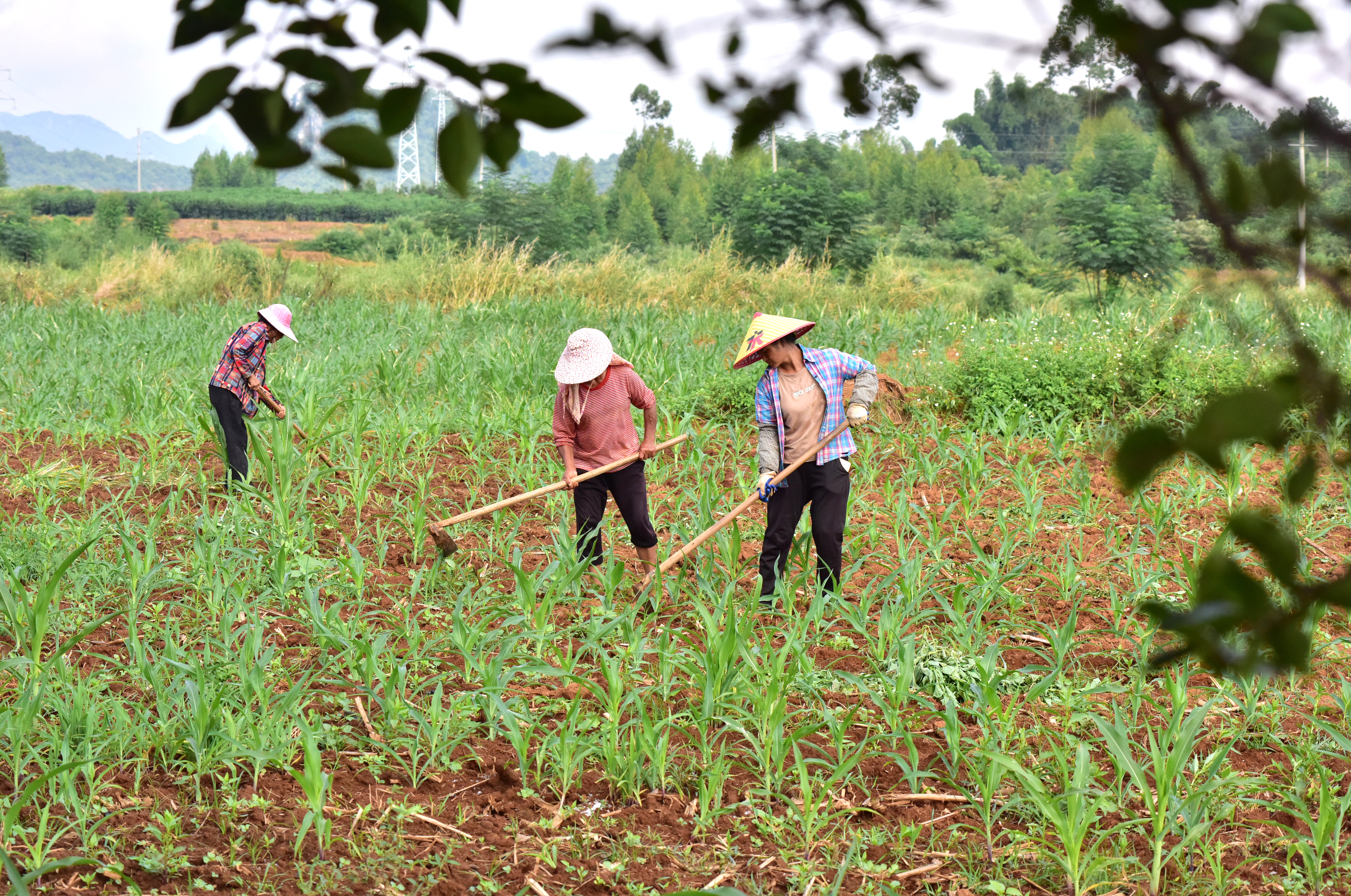 ↑ 9月5日,广西贺州市平桂区羊头镇大井村农民在玉米地里除草。新华社发(廖祖平 摄)