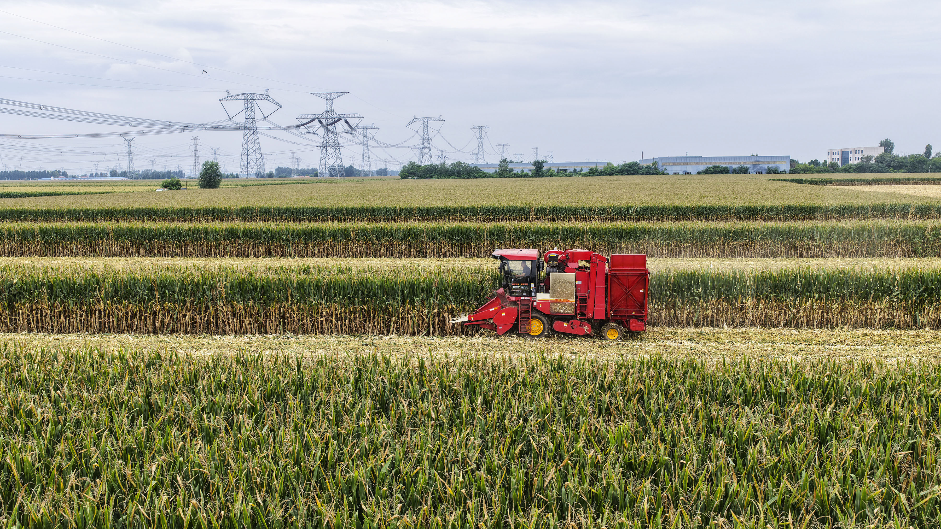 ↑ 9月5日,山东省临沂市平邑县临涧镇农民驾驶农机在田间收获玉米(无人机照片)。新华社发(武纪全 摄)