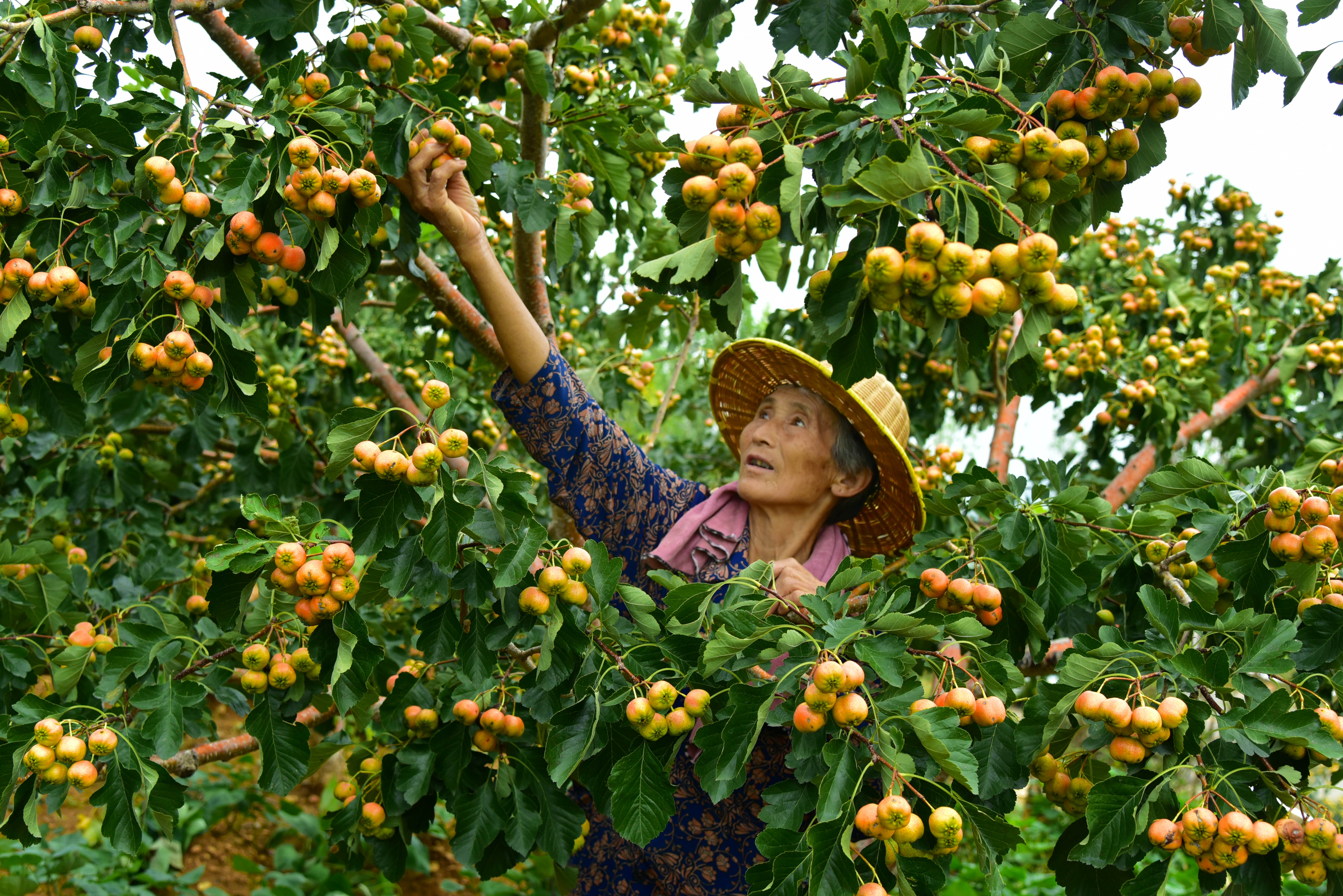 ↑ 9月5日,山东省枣庄市山亭区水泉镇板上村农民在果园采摘山楂。新华社发(刘明祥 摄)