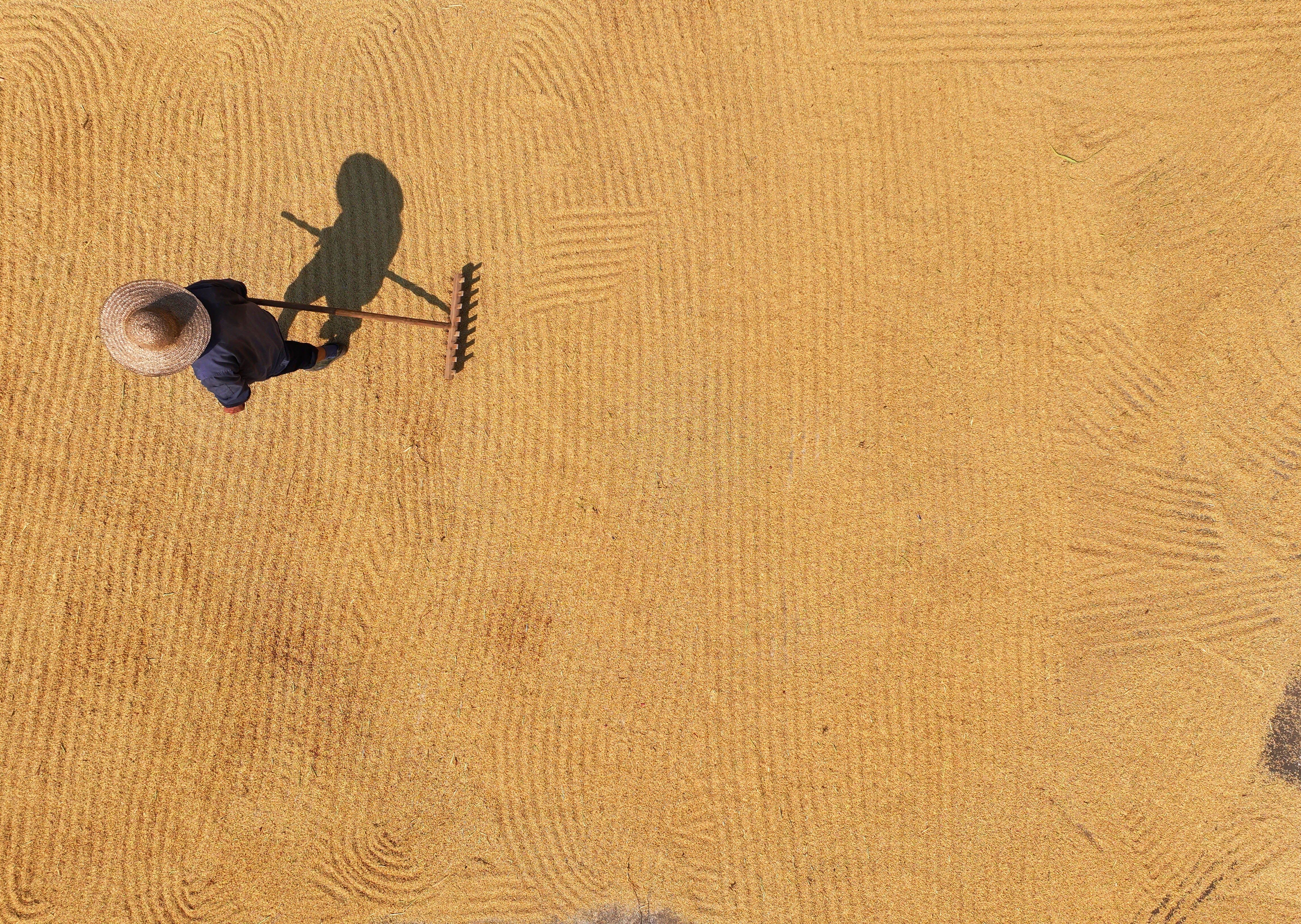 ↑ 9月6日,湖南省衡阳市衡东县大浦镇村民在晾晒稻谷(无人机照片)。新华社发(曹正平 摄)