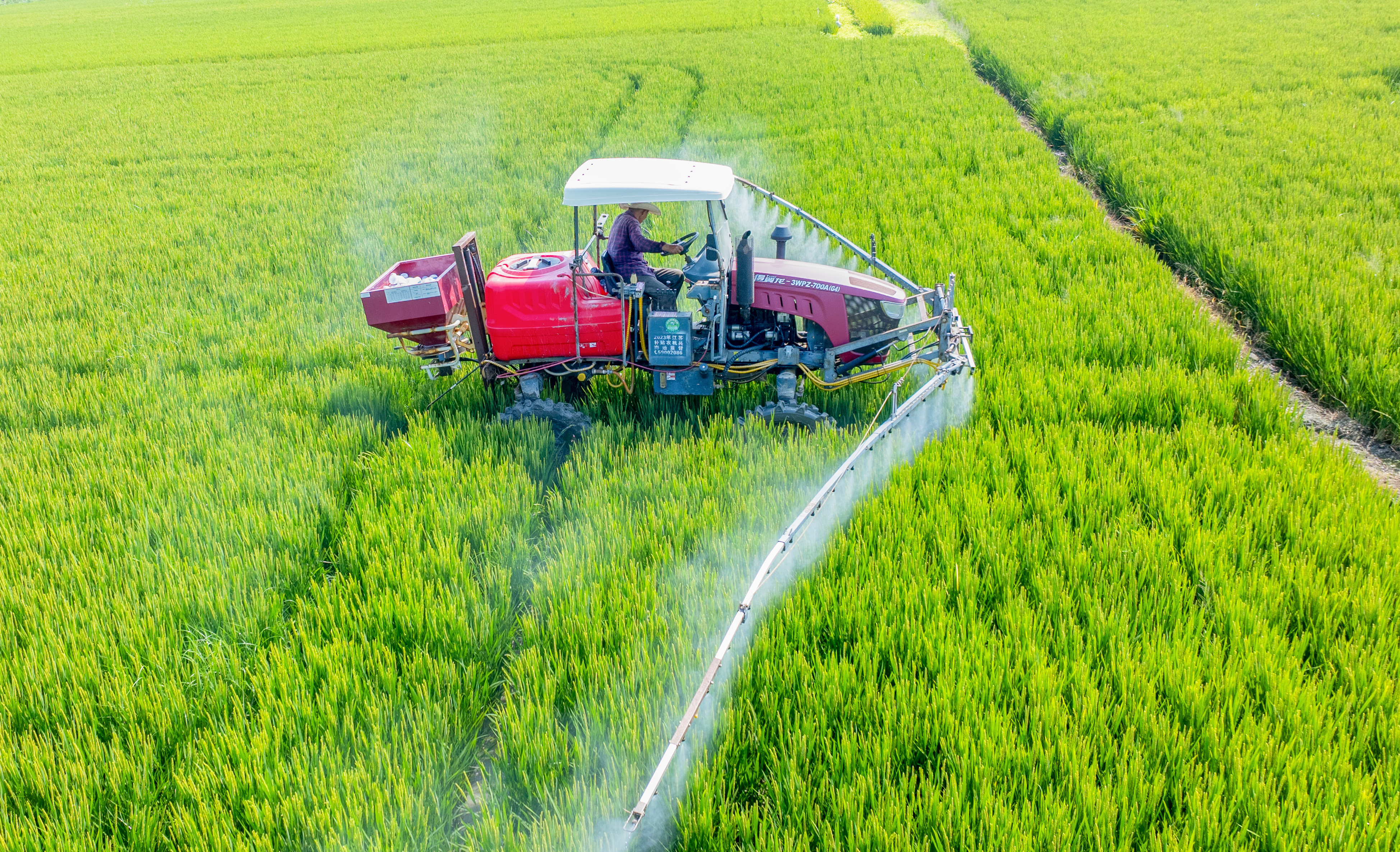 ↑ 9月6日,在江苏省海安市角斜镇范堑村,村民驾驶植保机械在水稻田里进行喷洒药物作业(无人机照片)。新华社发(翟慧勇 摄)