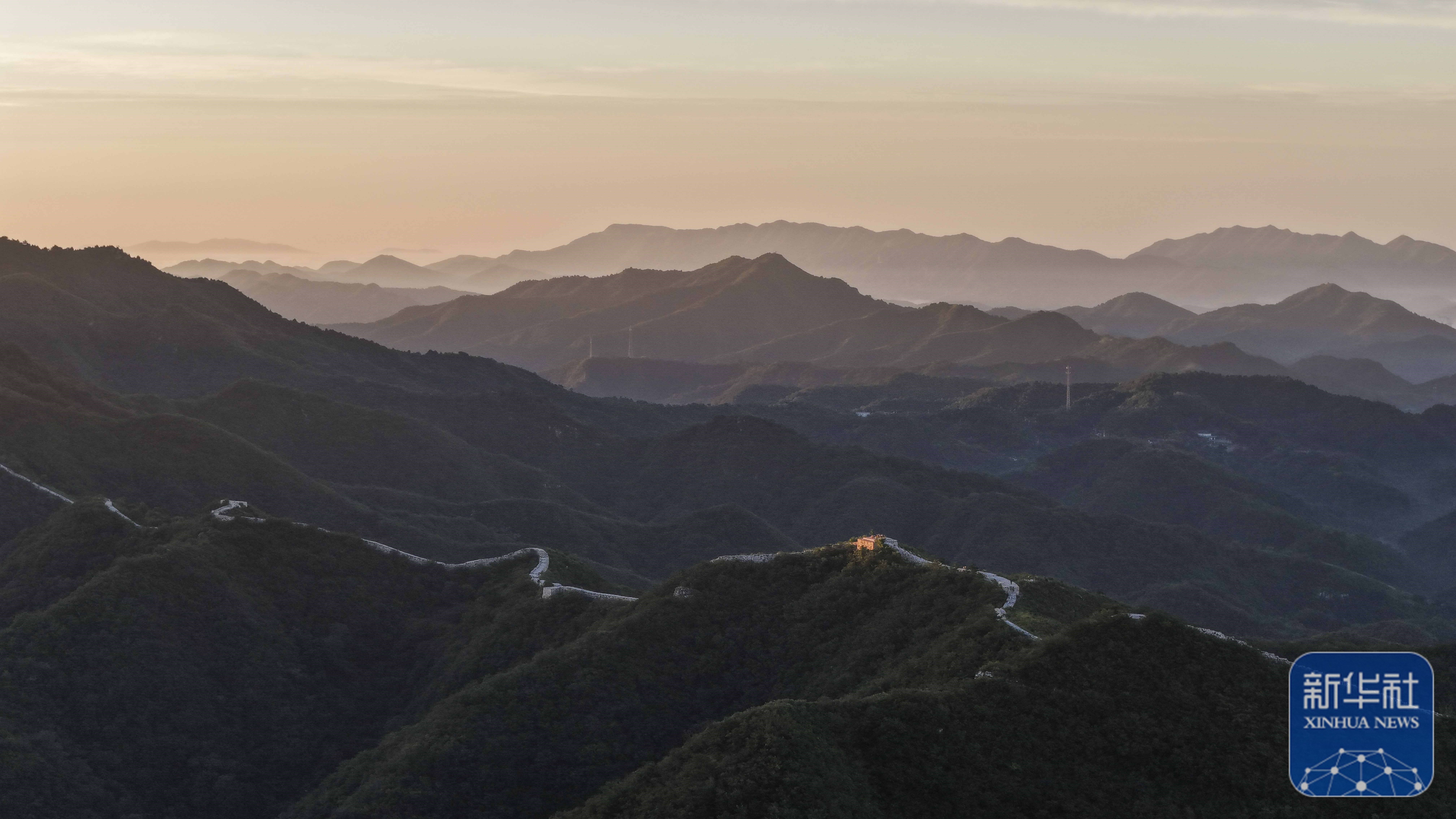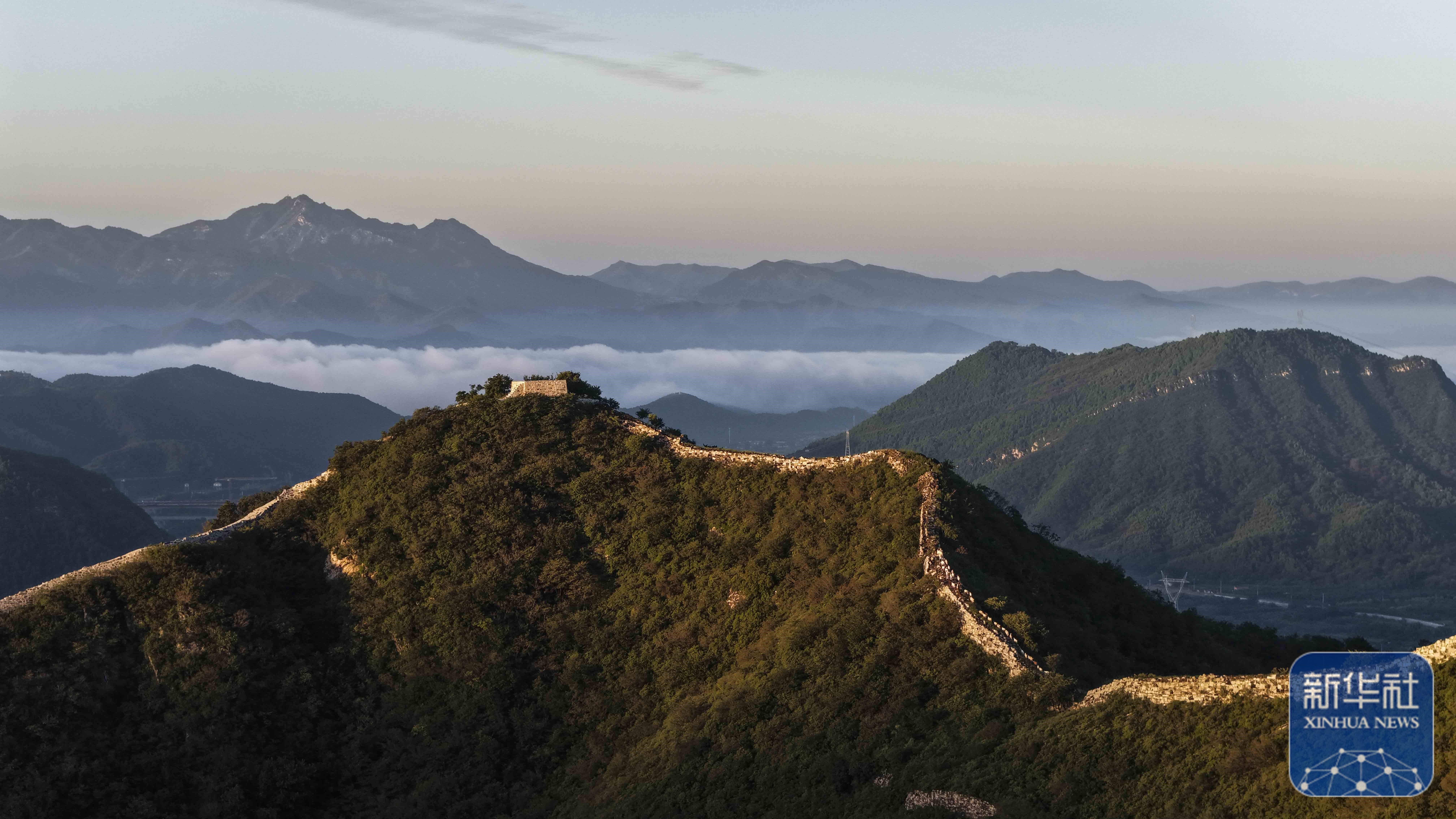 9月6日,位于北京市平谷区金海湖镇的红石门长城在雨后晨光的映衬下宏伟壮观(无人机照片)。新华社发(刘满仓 摄)