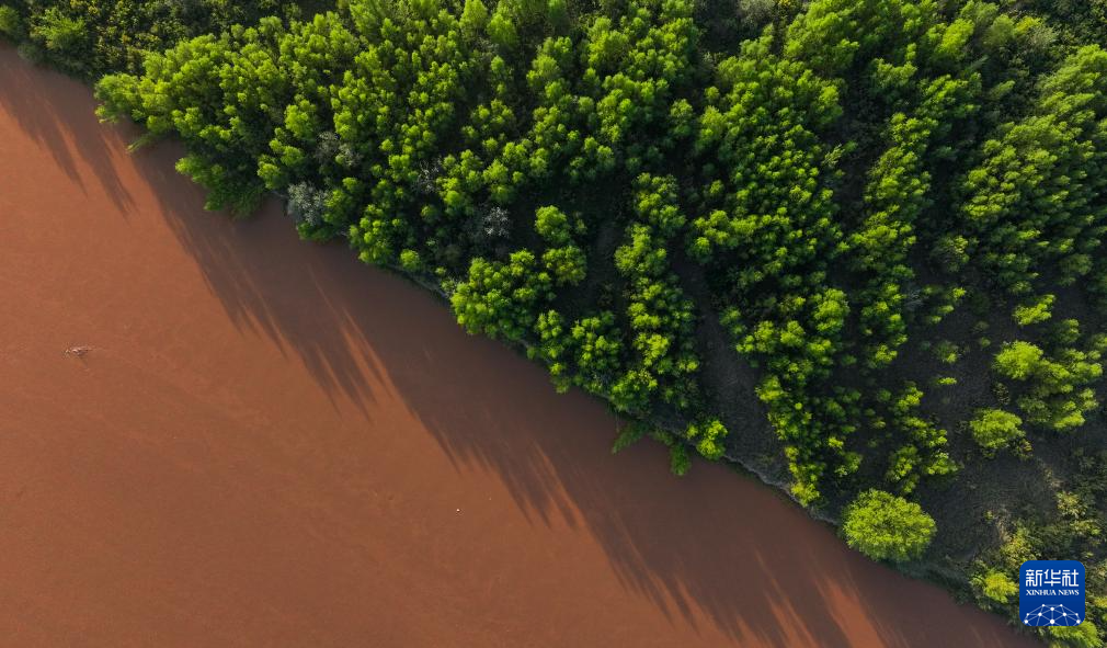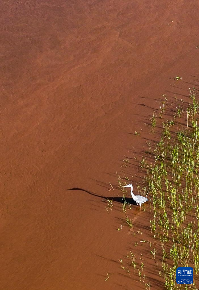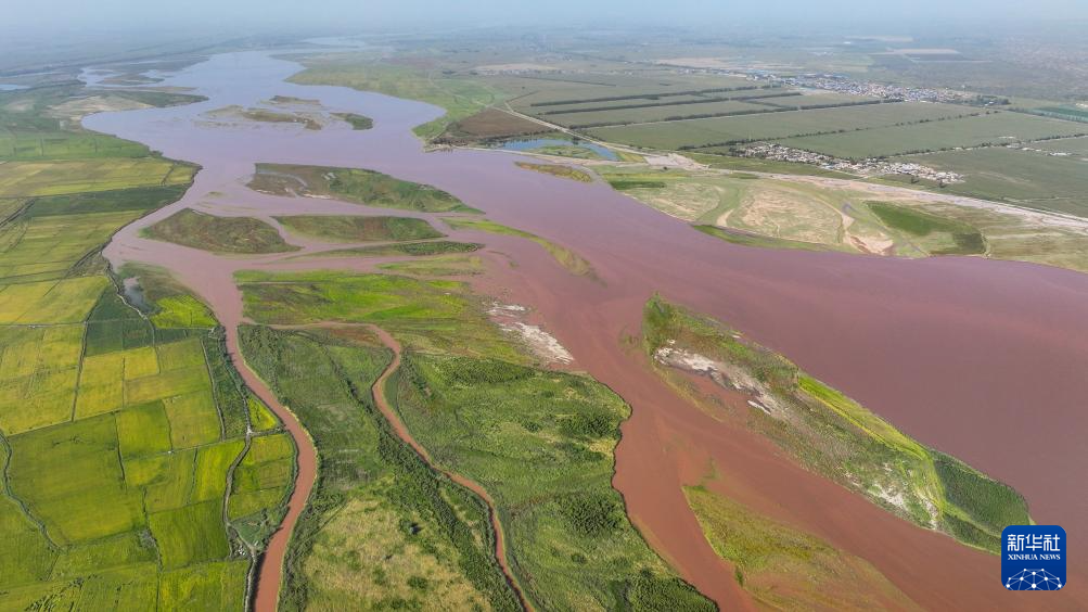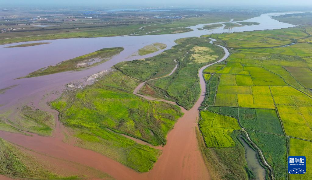 这是9月6日在宁夏石嘴山市平罗县境内拍摄的黄河滩涂湿地和稻田(无人机照片)。秋日时节,在黄河宁夏石嘴山段,蜿蜒曲折的河道与黄绿色的稻田构成一幅美丽的画卷。新华社记者 冯开华 摄