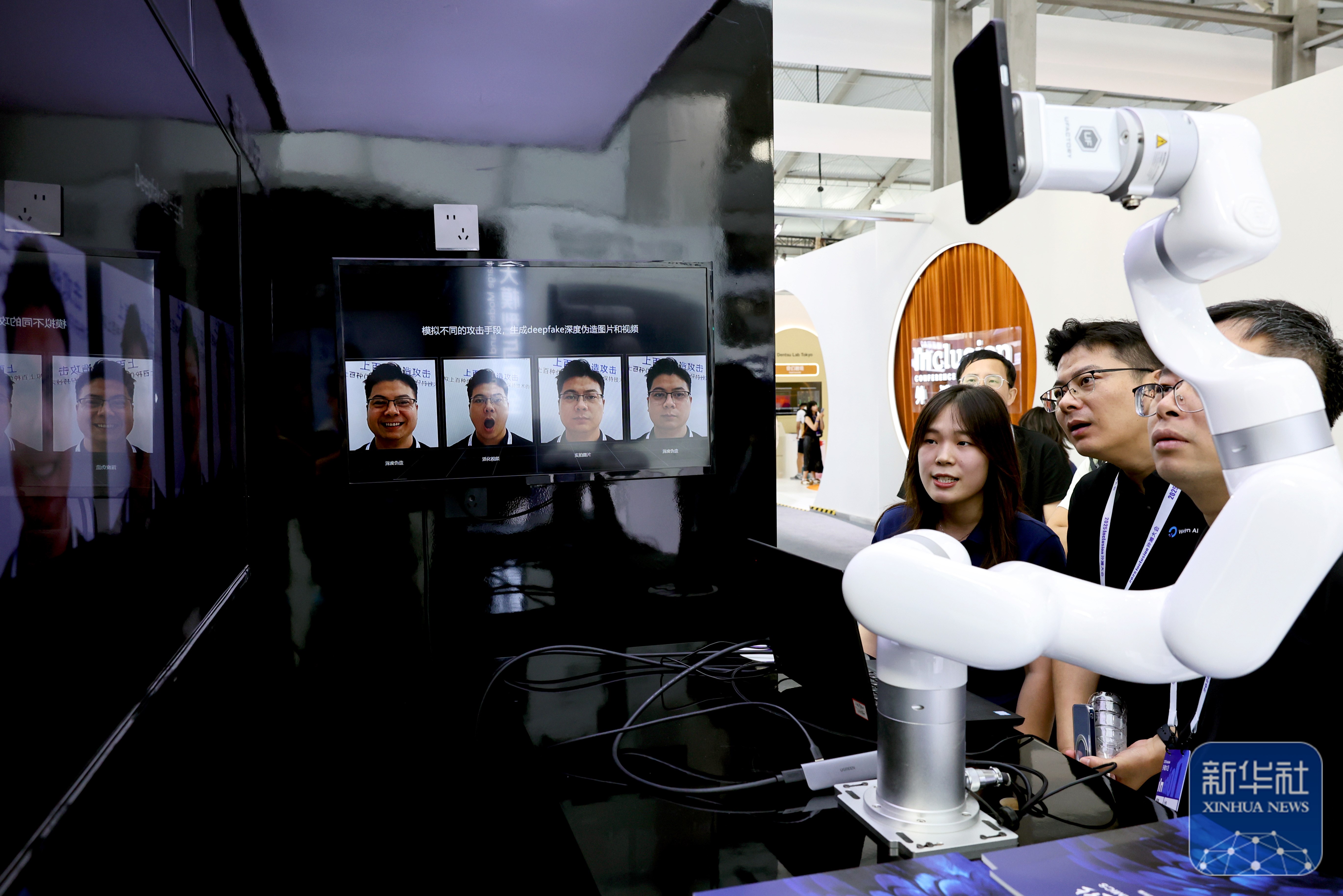 ↑9月10日,参观者在一个甄别AI换脸技术的演示设备前驻足观看。