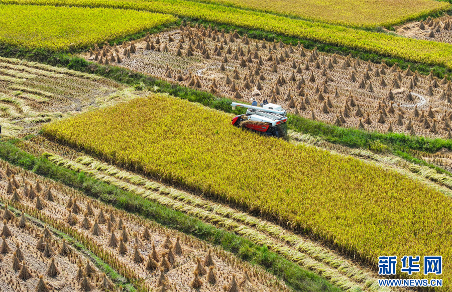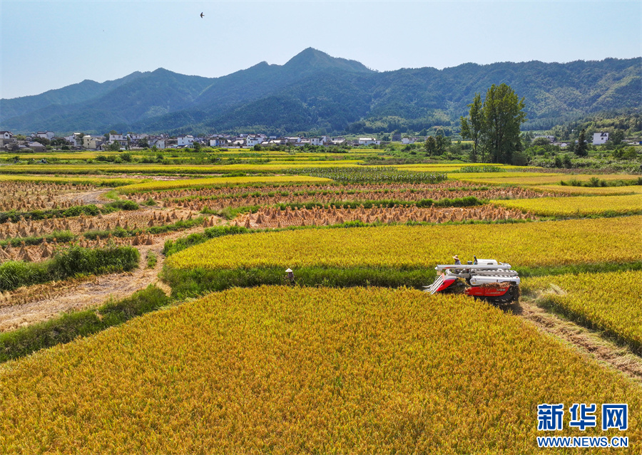 近日,安徽省黄山市黟县碧阳镇关麓村的水稻陆续成熟,农民抢抓晴好天气进行收割。收割机马力全开,在金灿灿的稻田里来回作业,田间地头一派繁忙景象。新华网发(施亚磊 摄)