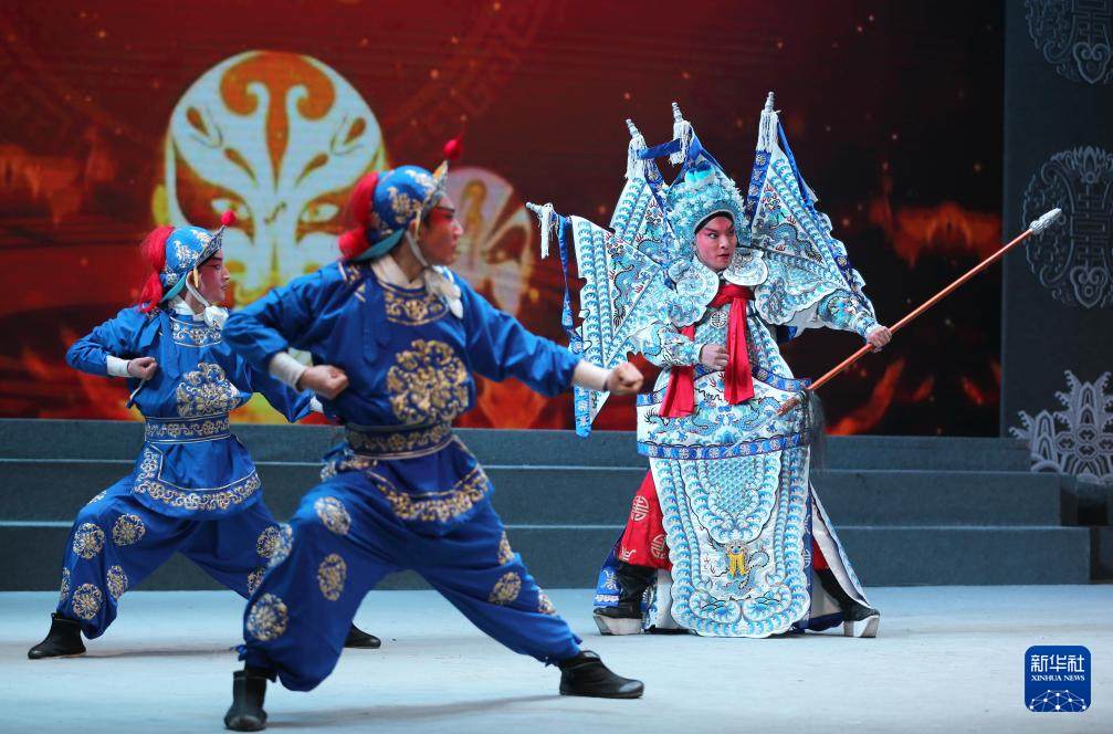 9月13日晚,在定西市陇中许铁堂秦腔剧院,演员表演秦腔武戏。新华社发(王克贤摄)