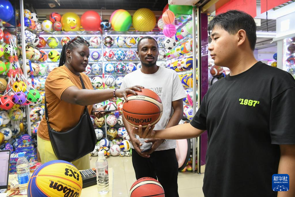 9月15日,外商在浙江省义乌国际商贸城三区商铺洽谈采购球类。新华社发(时宽兵摄)