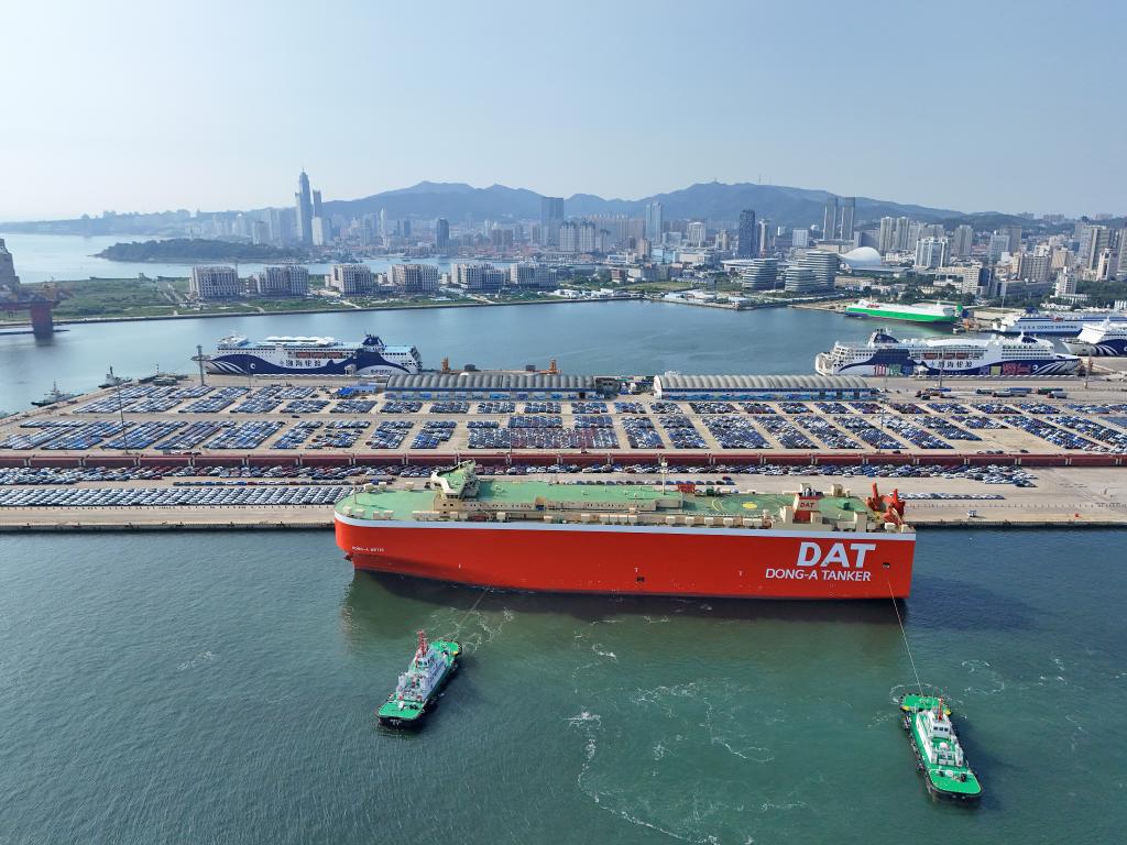 8月5日,装载着出口汽车的汽车运输船从山东港口烟台港起航(无人机照片)。新华社发(唐克 摄)