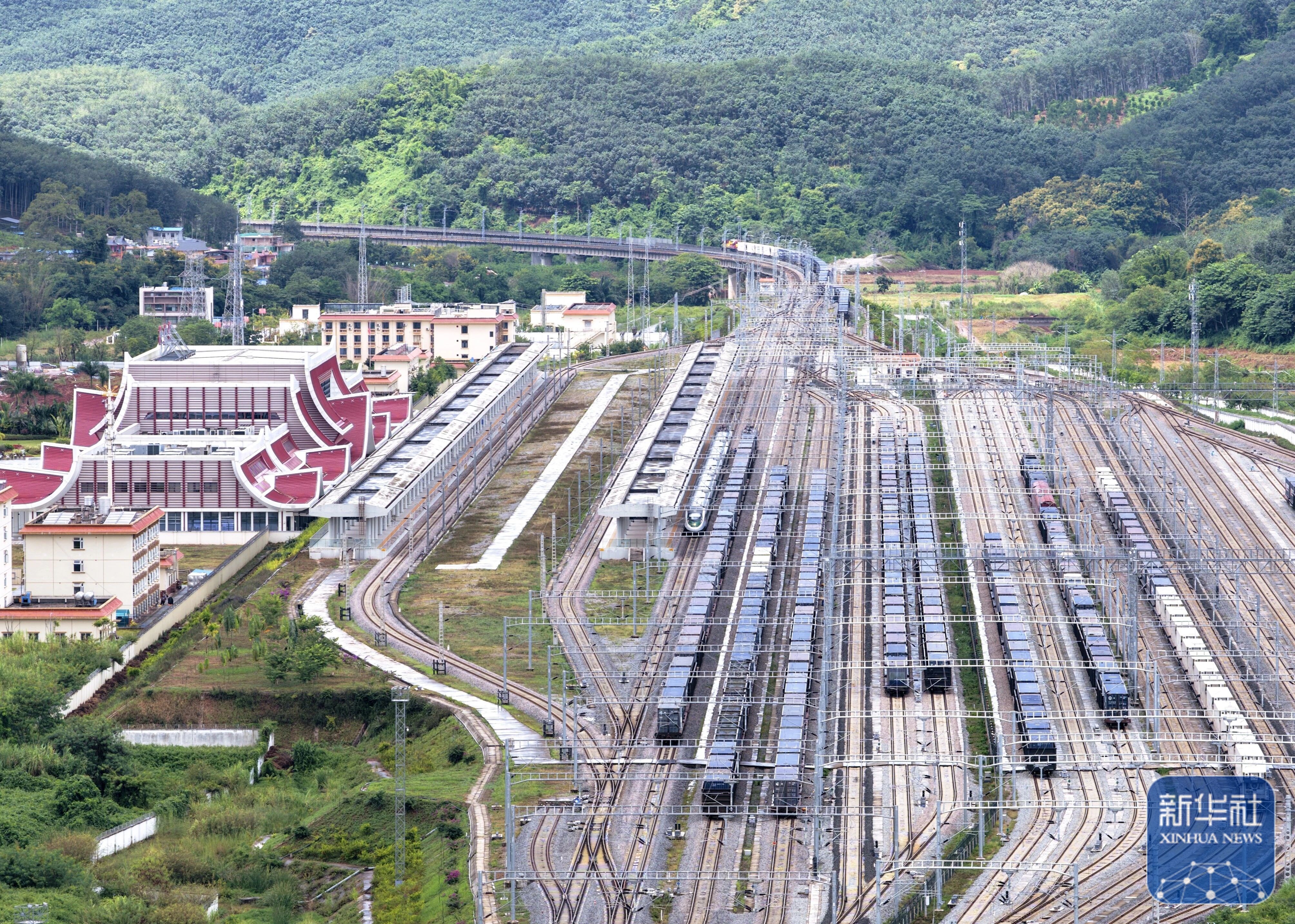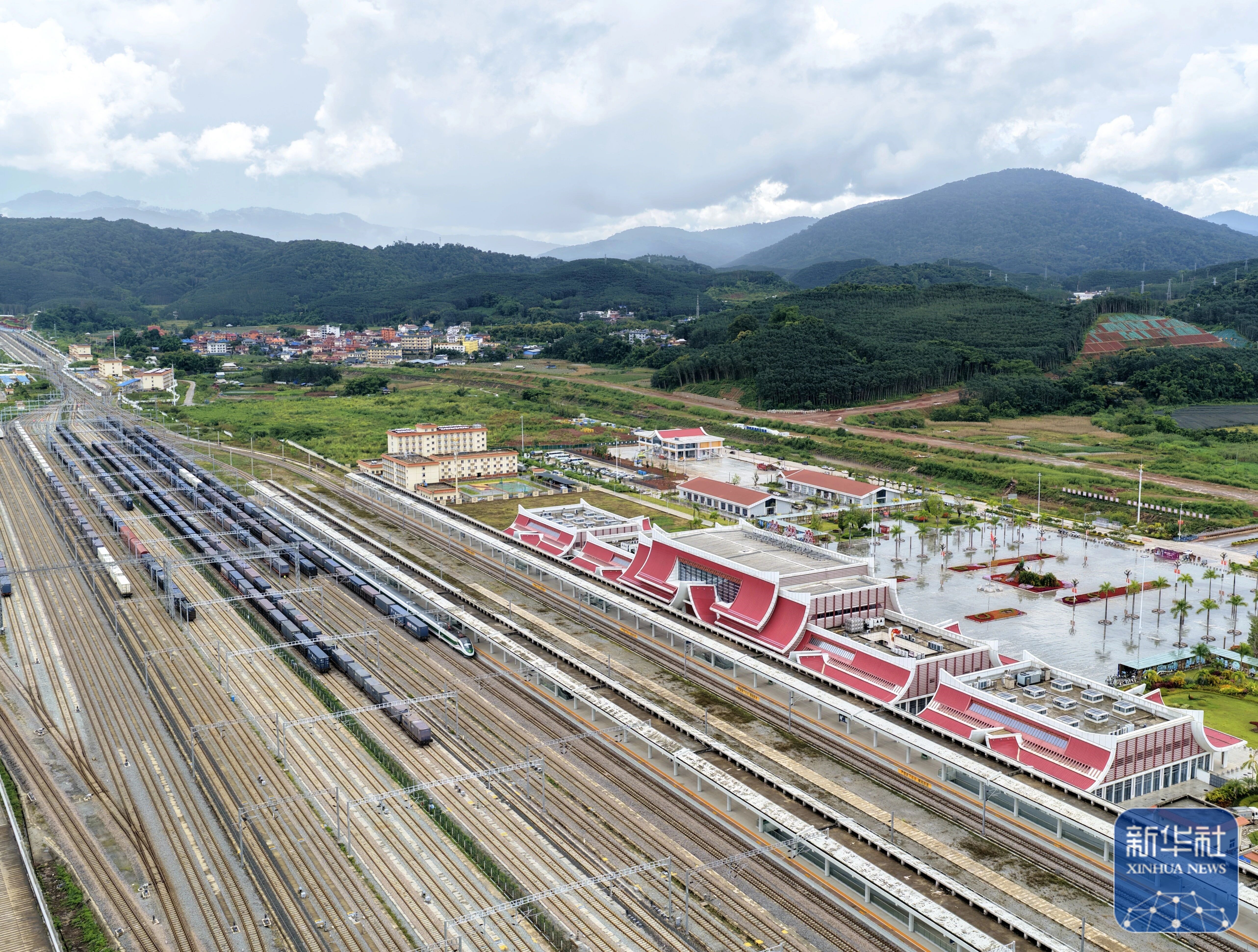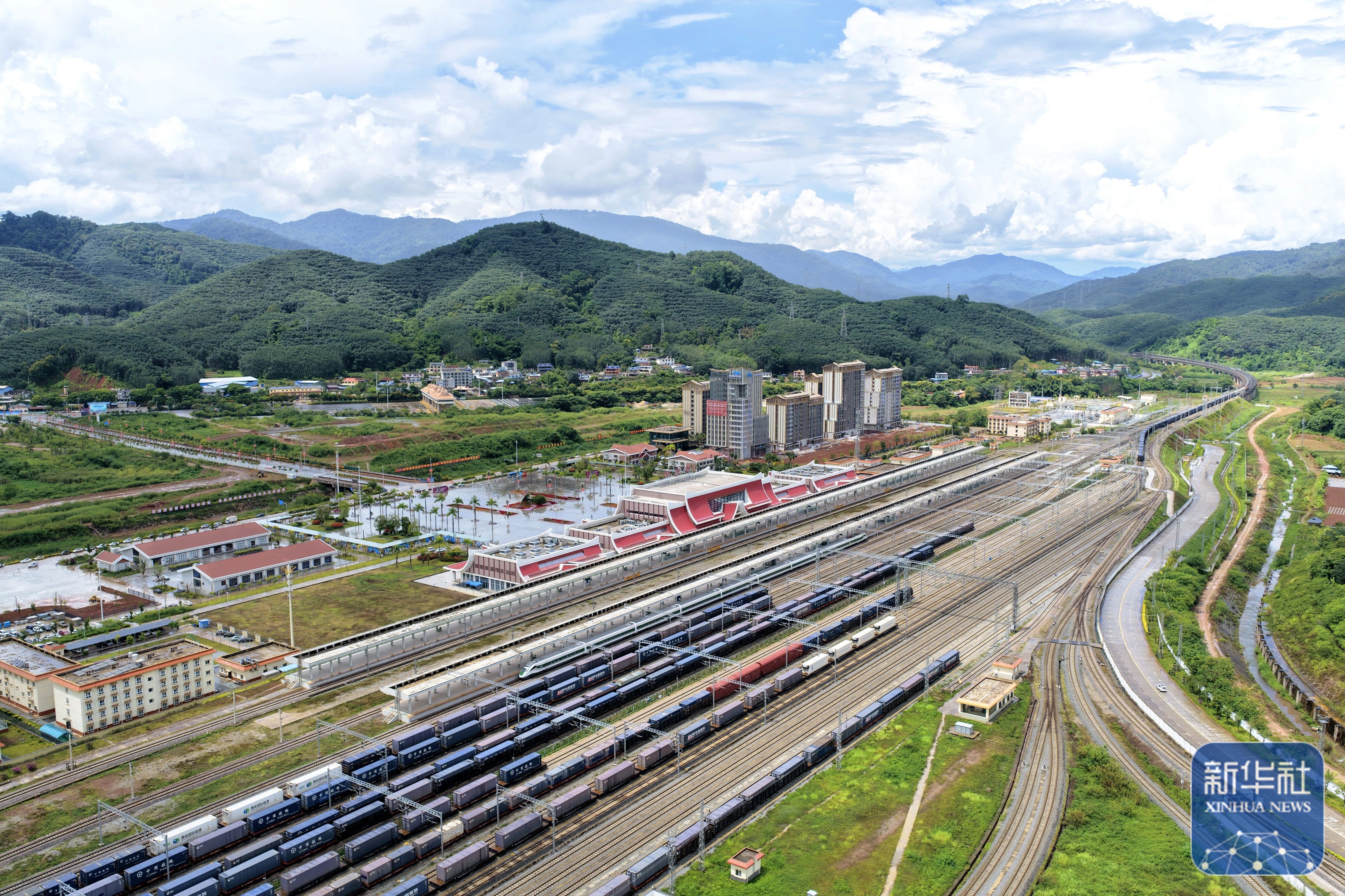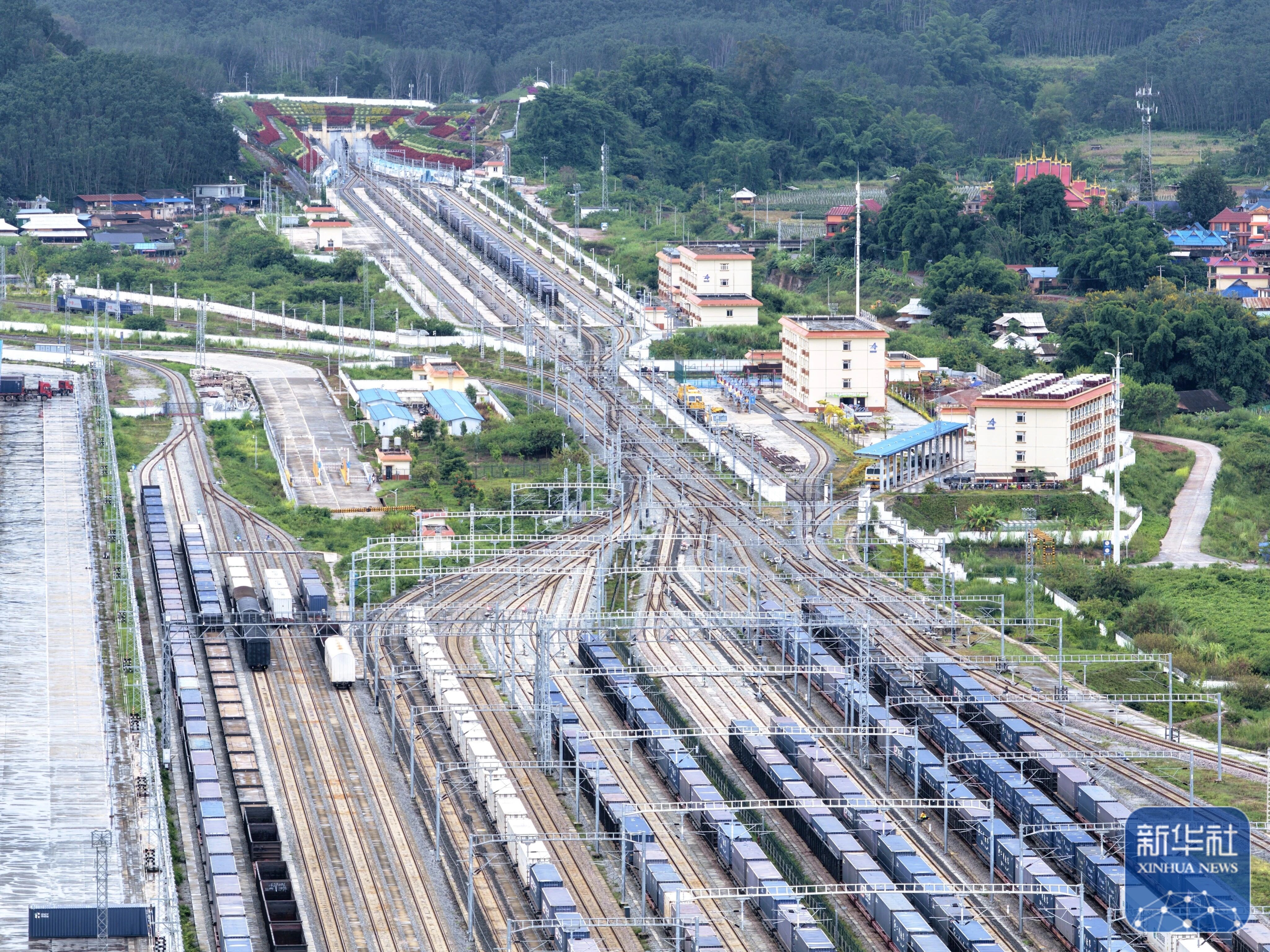↑ 9月21日,中老铁路上的货运列车在磨憨站通过(无人机照片)。