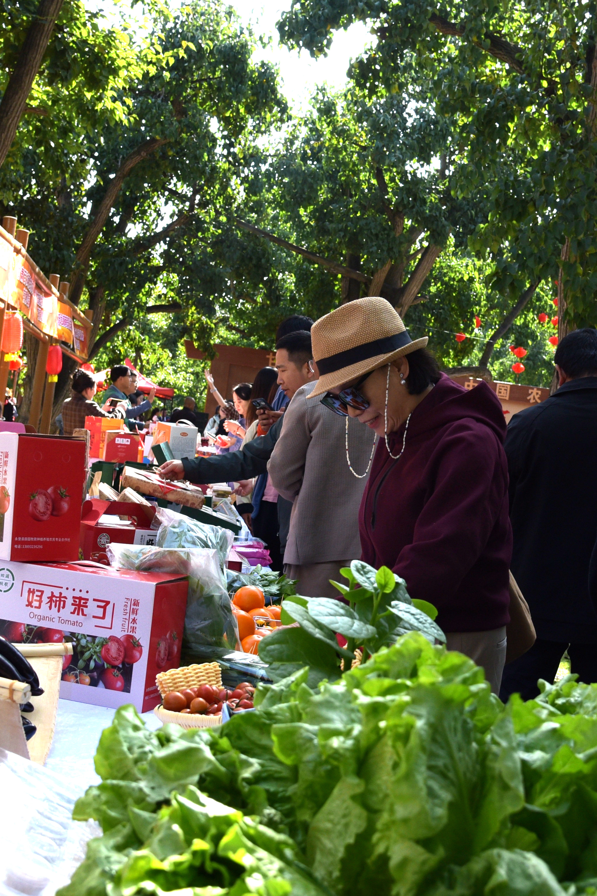 ↑9月23日,在甘肃省兰州市皋兰县什川古梨园举办的庆祝中国农民丰收节活动现场,人们在挑选特色农产品。新华社记者 王朋 摄