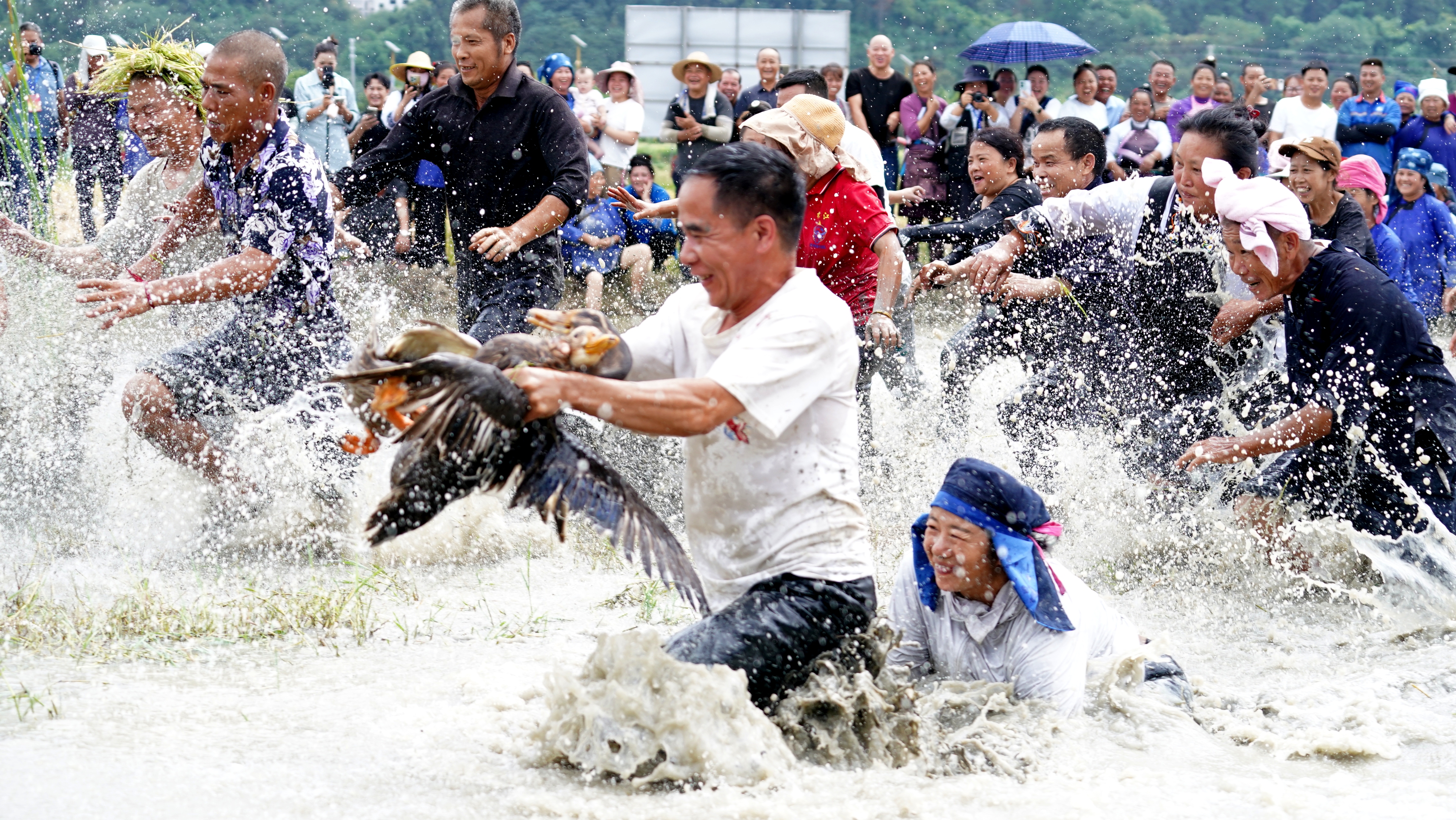 ↑9月23日,在位于福建省三明市建宁县溪源乡楚尾村的丰收节活动现场,选手参加抓鸭子比赛。新华社发(陈震摄)