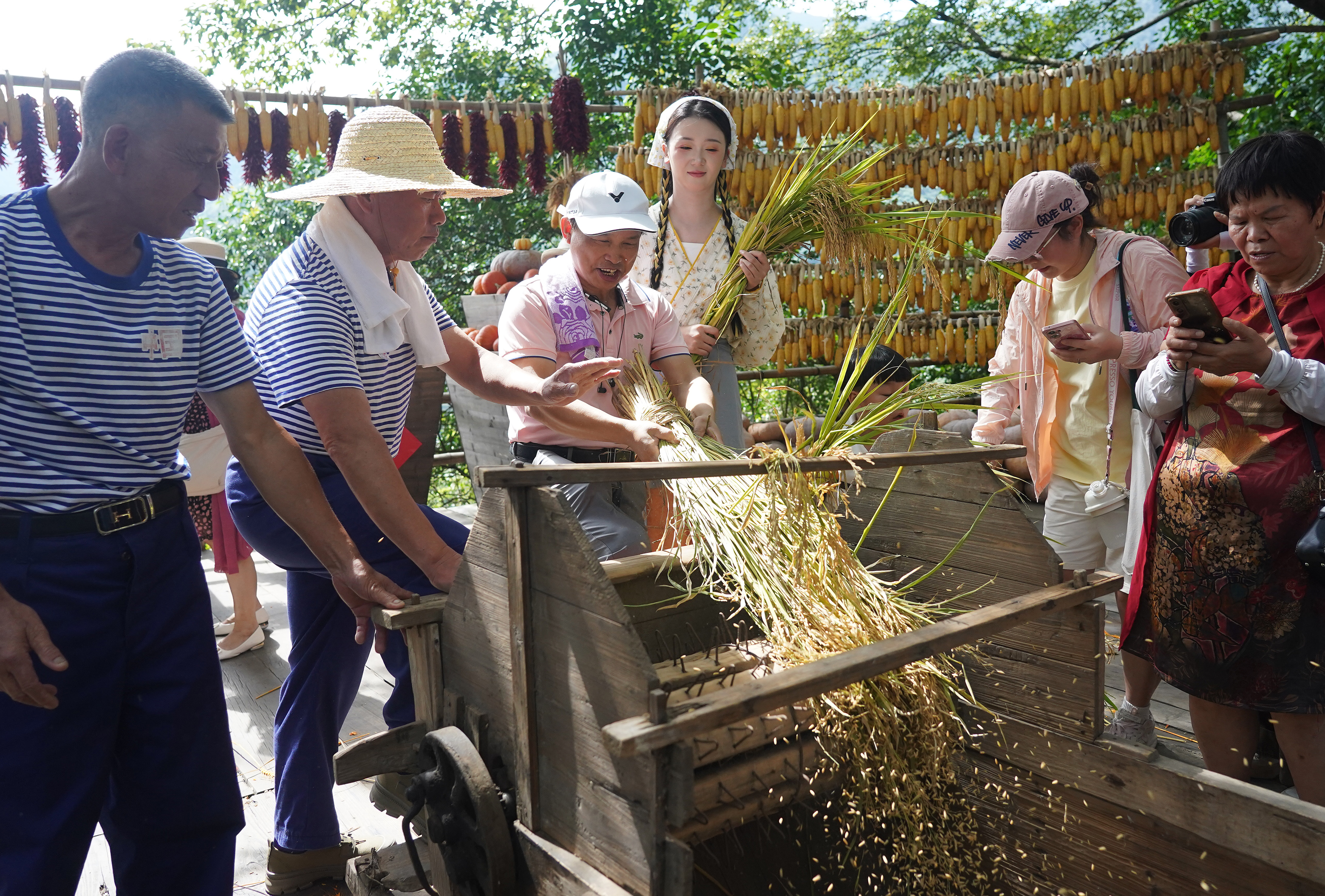 ↑9月23日,游客在江西省婺源县篁岭景区体验传统打谷劳作。新华社记者 万象 摄