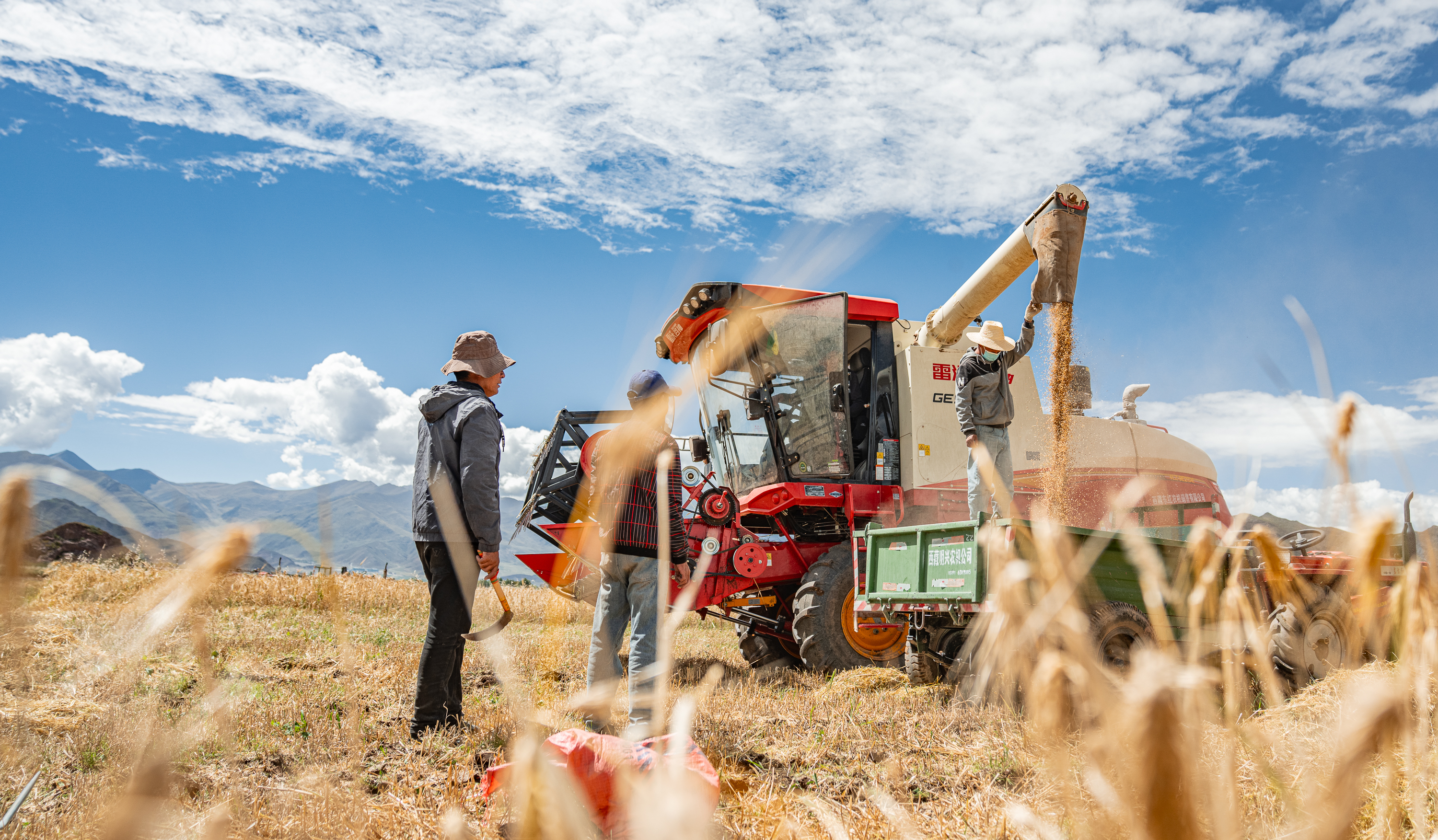 ↑9月23日,在西藏拉萨市林周县松盘乡岗巴村,农民用收割机收获青稞。新华社记者 丁增尼达 摄