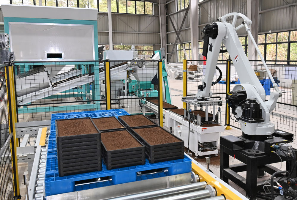 在浙江省东阳市皇野生态农业有限公司现代农事服务中心,全自动智能水稻育秧生产线在制作秧盘(2025年3月13日摄)。新华社发(包康轩 摄)