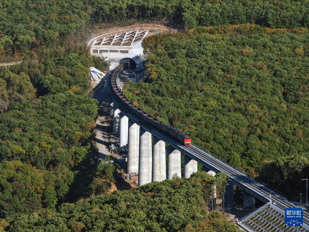 9月27日,满载大宗品类货物的入境列车在滨绥铁路绥芬河至国境线提质改造工程新线路上行驶(无人机照片)。新华社记者 王松 摄