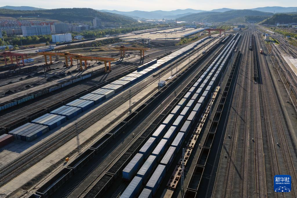 9月27日,满载货物的列车在绥芬河站北场进行换装作业(无人机照片)。新华社记者 王松 摄