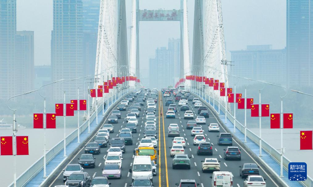 10月1日,车辆行驶在湖北省武汉长江二桥上(无人机照片)。新华社记者 肖艺九 摄
