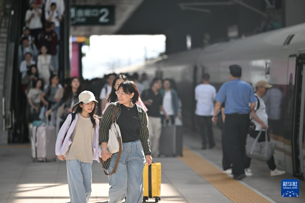 10月1日,旅客在昆明火车站乘车出行。新华社发(郑益摄)