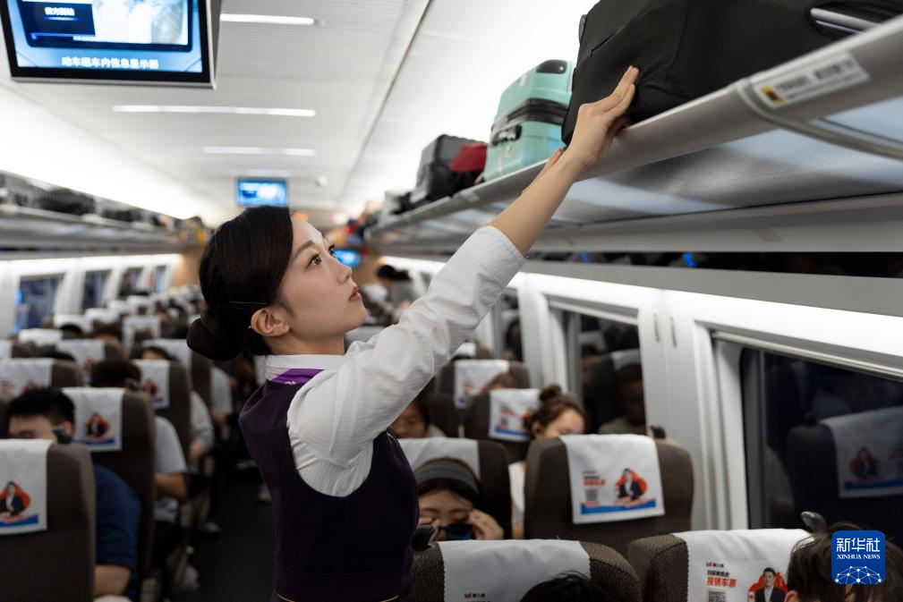 10月1日,铁路上海客运段乘务员为旅客整理行李架。新华社记者 王翔 摄