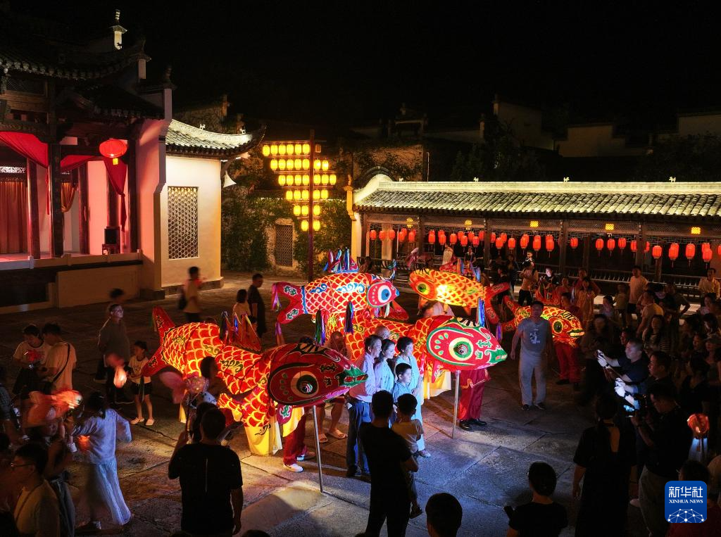 10月1日晚,在安徽省黄山市黟县秀里古村,游客与鱼灯合影(无人机照片)。新华社记者 杜宇 摄