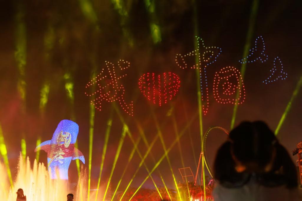 广东珠海长隆海洋王国推出特色光影秀,为游客献上了视觉盛宴——超600台无人机的编队变幻出企鹅、鲸鲨等珍稀海洋动物,结合绚烂的灯光投影以及红色主题的节目编创,再加上珠海科技“特产”无人船,360度环绕烟花效果……