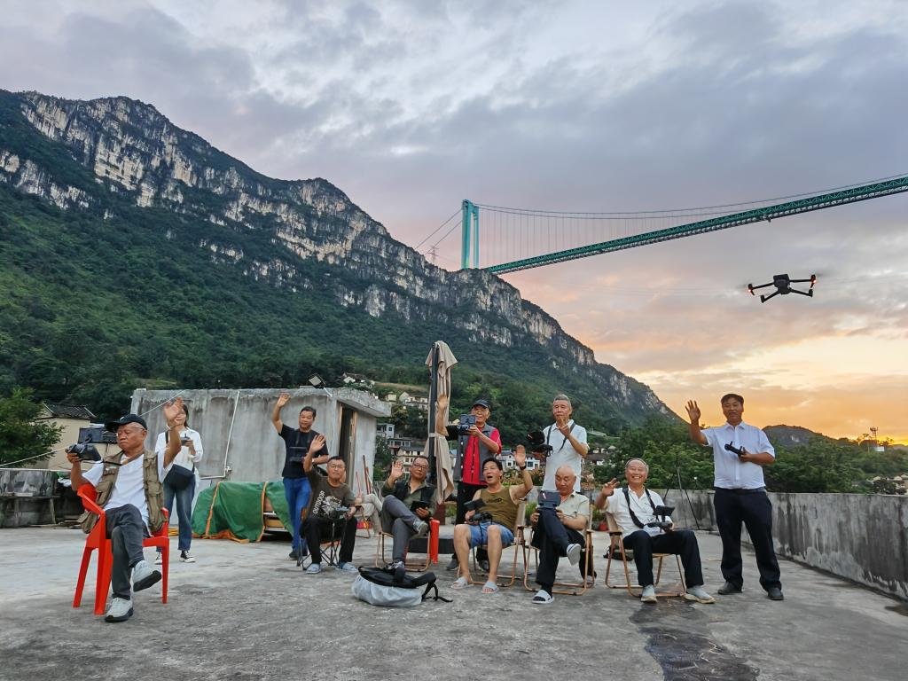 当夕阳的余晖洒向花江村,一栋民房的天台聚集了十多位摄影师,他们手中相机、无人机按键的声音此起彼伏,只为捕捉高桥与晚霞同框的美妙瞬间。