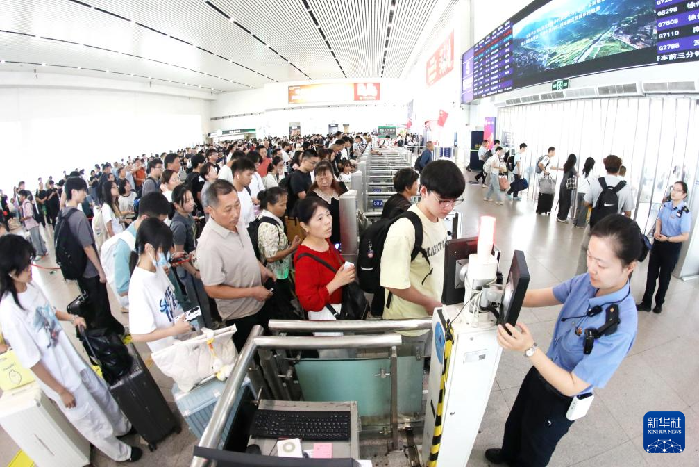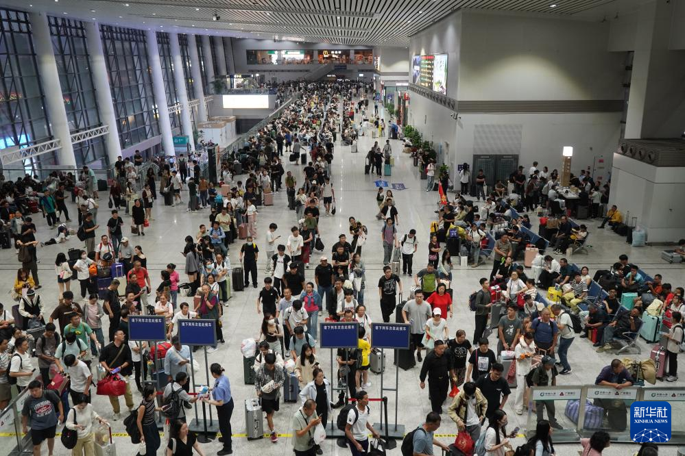 10月8日,旅客在南京火车站有序出站。新华社发(苏阳摄)