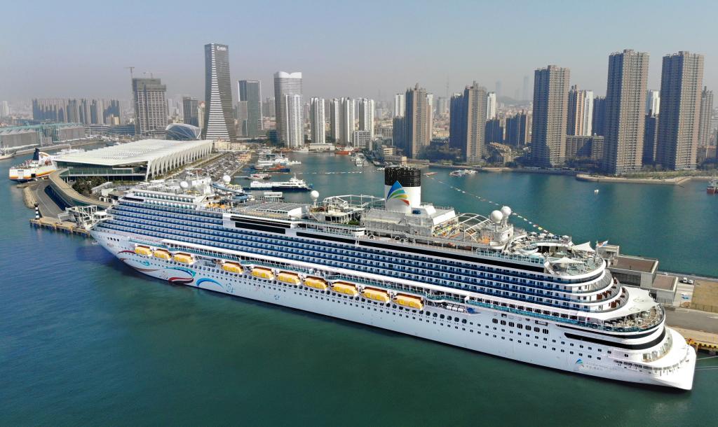 “爱达·魔都号”邮轮靠泊在青岛邮轮母港码头(4月6日摄,无人机照片)。新华社记者 李紫恒 摄