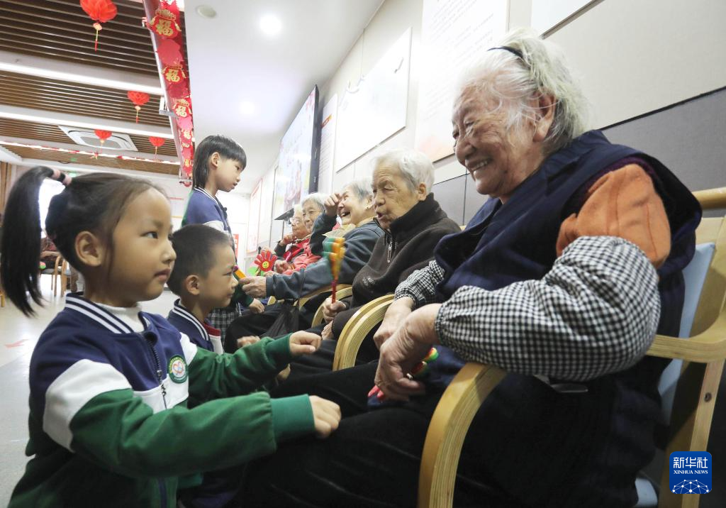 10月29日,江苏省苏州市姑苏区彩香二村幼儿园的小朋友来到彩香老年公寓看望老人。 新华社发(杭兴微摄)