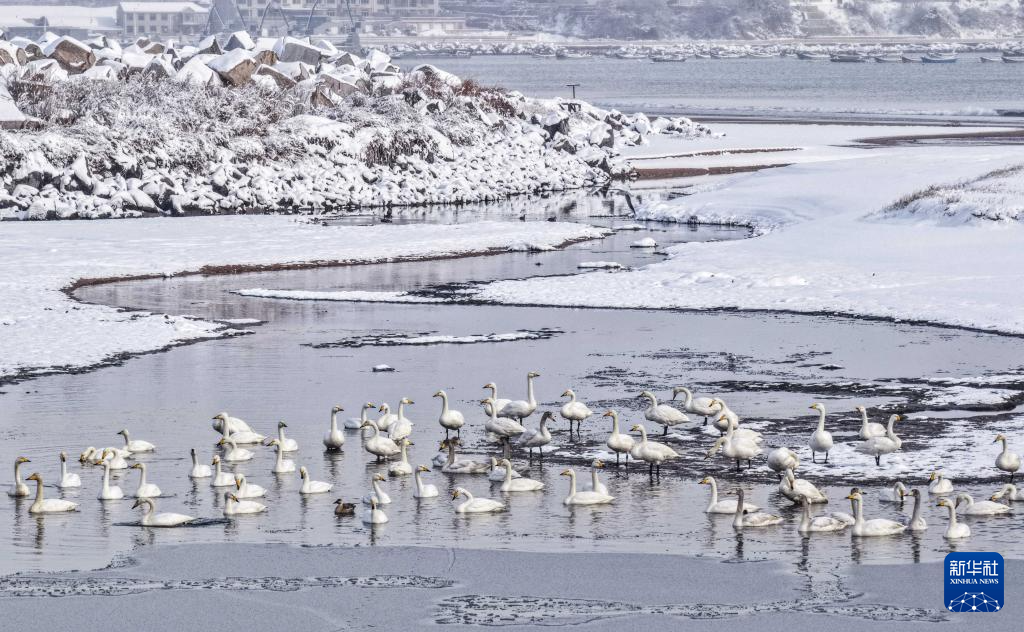 1月11日,大天鹅在雪后的山东省荣成市成山镇西霞口隆霞湖公园栖息、游弋、觅食。新华社发(李信君摄)