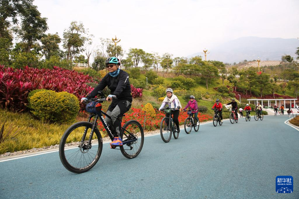 1月10日,骑行爱好者在云南省昭通市巧家县滨江休闲运动生态廊道生态绿湾骑行。新华社发(闫科任摄)