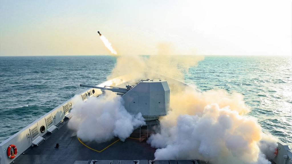 面对任务海域复杂环境,指挥员迅速研判态势,命令主炮战位做好射击准备,各舰运用雷达、光电系统跟踪锁定目标。随着一枚枚炮弹呼啸而出,目标被成功“摧毁”。