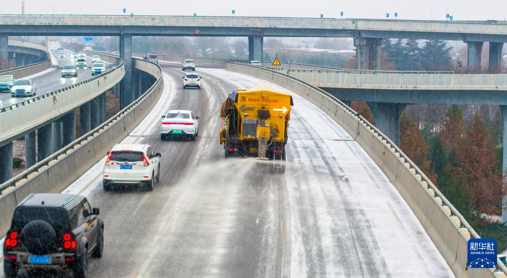 1月19日,在河南省洛阳市古王立交,市政集团车辆对道路进行撒布融雪剂作业(无人机照片)。新华社发(张怡熙摄)
