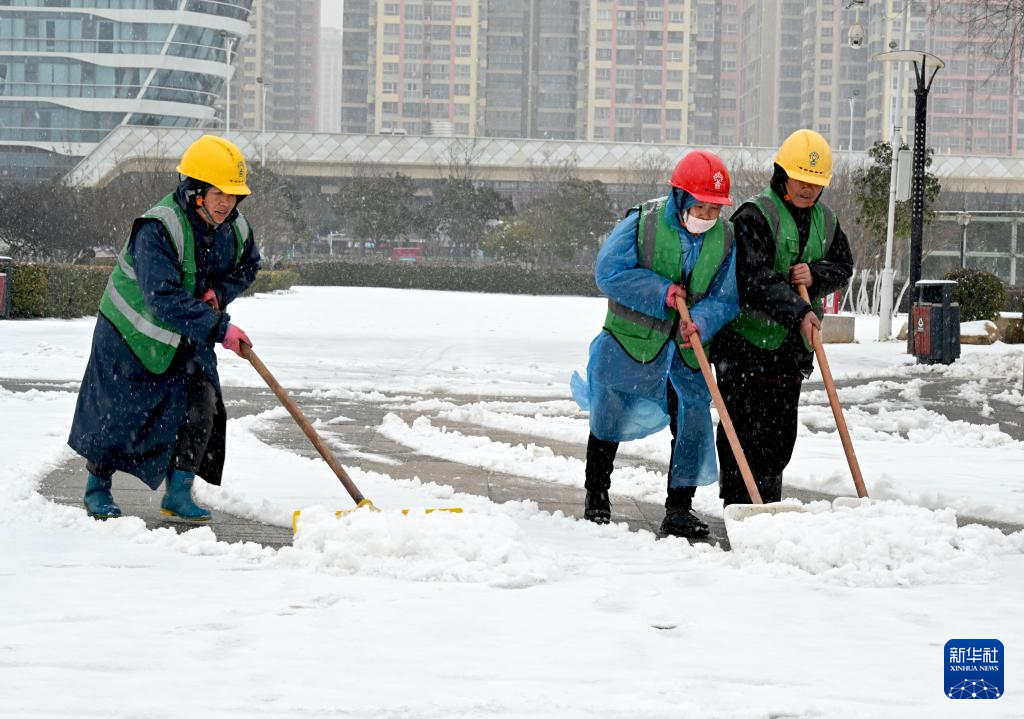 1月19日,在安徽省亳州高新区市政公园,园林工人在清理路面积雪。新华社发(刘勤利摄)