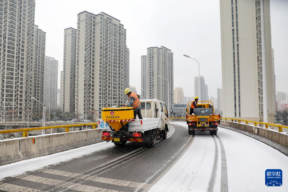 1月19日,安徽省淮北市市政工程管理处的工作人员在撒盐除雪。新华社发(万善朝摄)