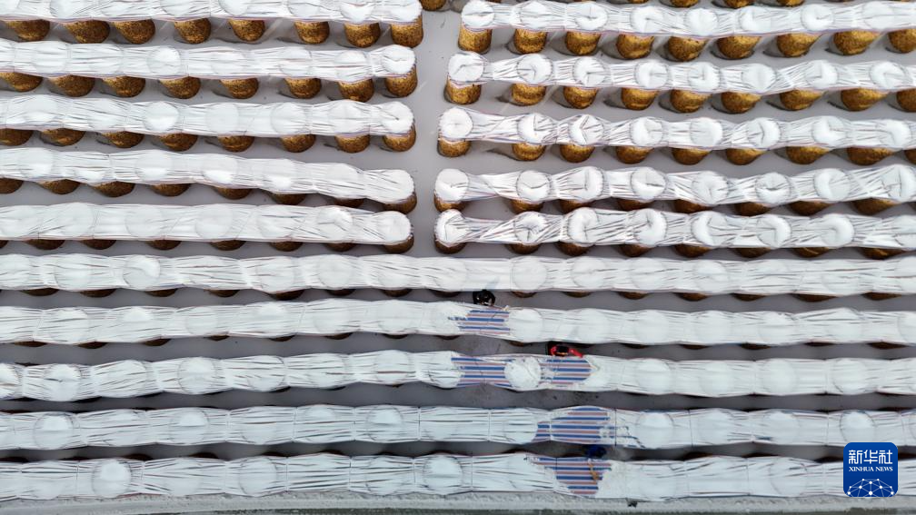 1月19日,山东省滨州市滨城区杨柳雪镇的农民在清理玉米囤苫盖上的积雪(无人机照片)。新华社发(初宝瑞摄)