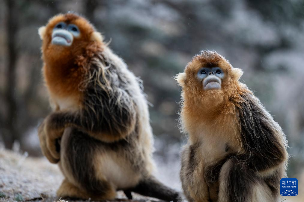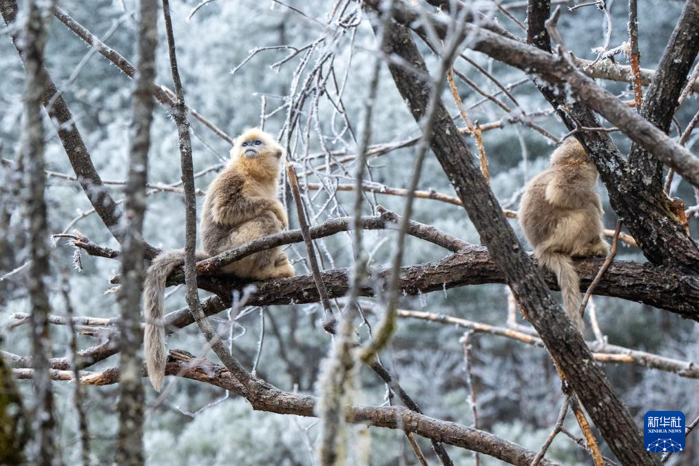1月19日,两只金丝猴在神农架国家公园大龙潭金丝猴野外研究基地树枝上休憩。新华社记者 杜子璇 摄