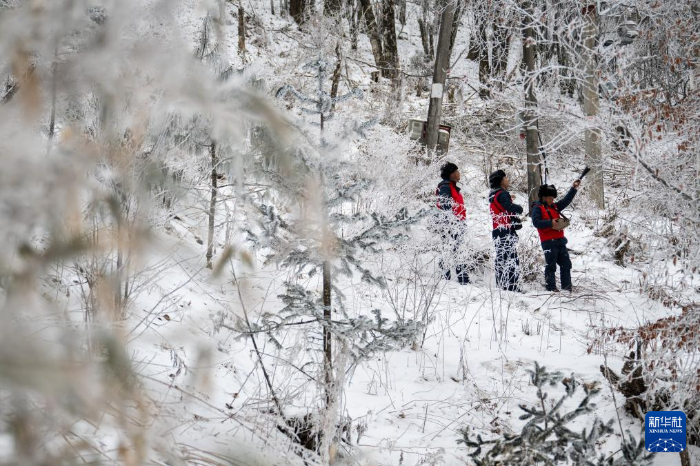 1月21日,在神农架林区木鱼镇,木鱼供电所运维人员检测线路设备是否有放电情况。新华社记者 伍志尊 摄