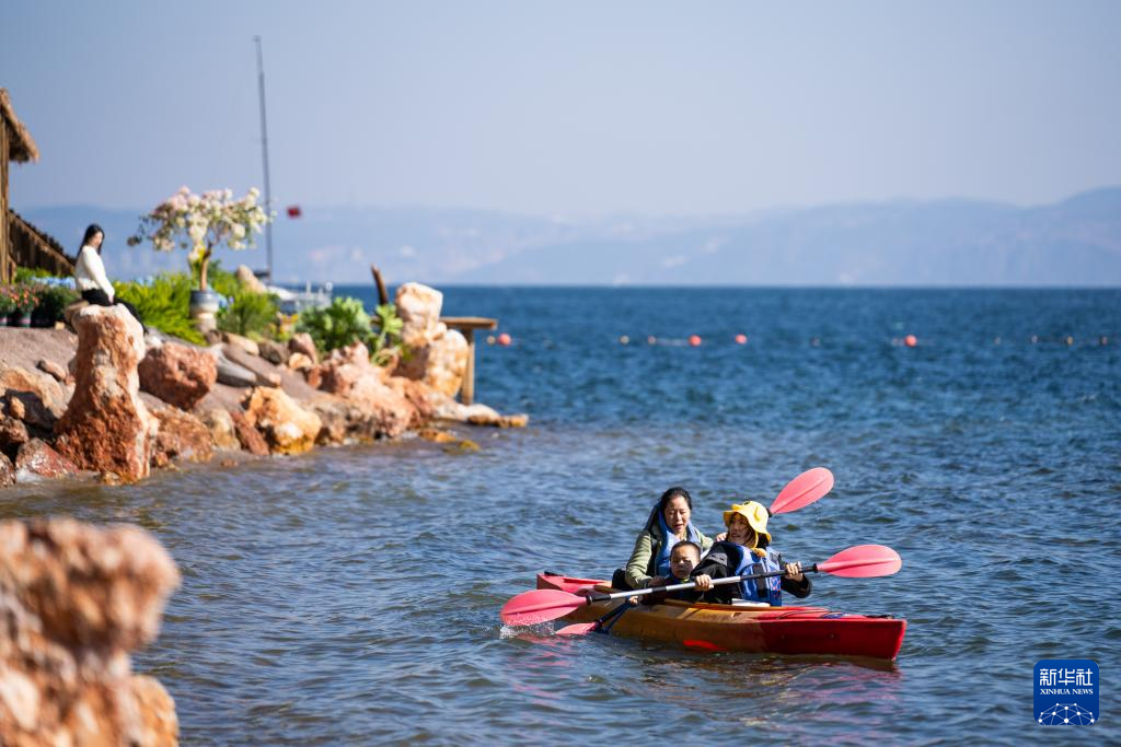 1月27日,游客在云南省玉溪市抚仙湖划船游玩。新华社记者 高咏薇 摄