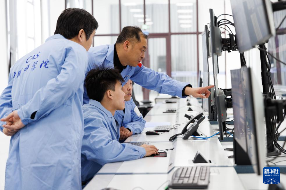 1月24日,施胜浦(左三)、高景飞(左一)、李强(左四)、田冬(左二)在漠河站机房监测卫星数据接收系统运行情况。新华社记者 金立旺 摄
