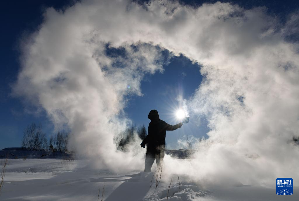 1月25日,工作之余,田冬在玩泼水成冰。新华社记者 金立旺 摄