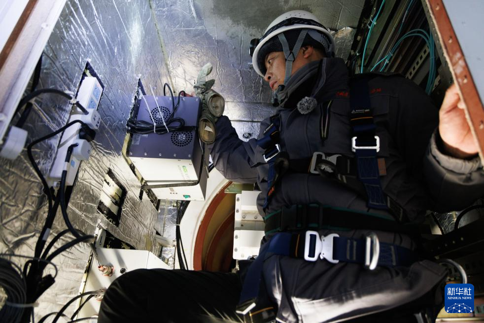 1月25日,站长施胜浦在天线的中心体里维护设备。新华社记者 金立旺 摄