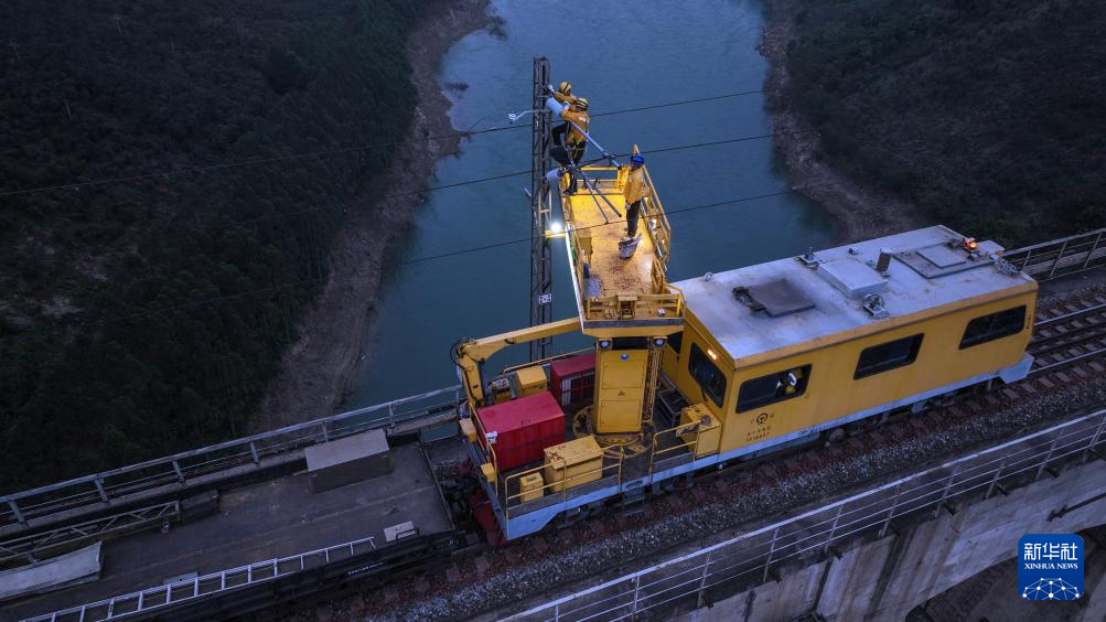 1月29日,中国铁路南宁局集团有限公司南宁供电段的接触网工在南盘江铁路大桥上检修接触网设备。新华社记者 张爱林 摄