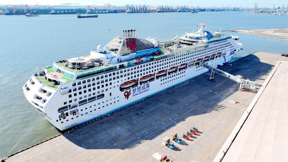 利比里亚籍“梦想”号邮轮靠泊天津国际邮轮母港。新华社发