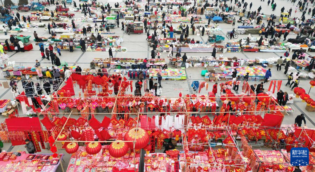 2月4日,在甘肃省临夏回族自治州永靖县刘家峡镇年货市场,人们选购年货(无人机照片)。新华社发(史有东摄)